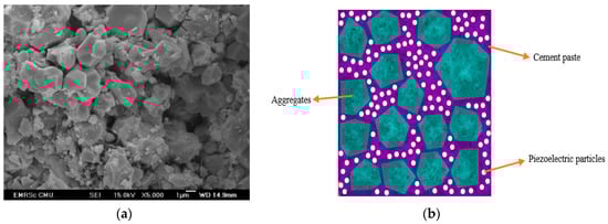(a) SEM image of a cement + PZT particles composite. Reprinted with permission from []. (b) Internal structure of a piezoelectric cement composite. Reprinted with permission from [].