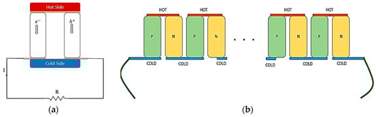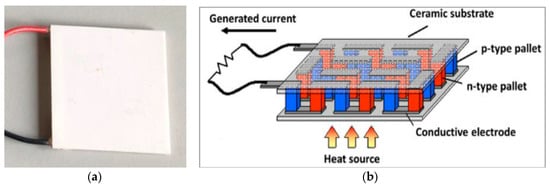 (a) Thermoelectric generator (TEG). (b) Internal arrangement of a TEG. Reprinted with permission from [].
