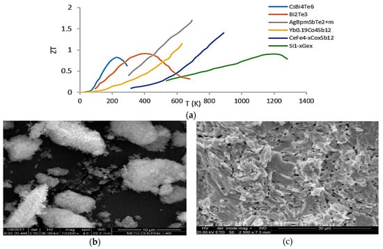 (a) Famous thermoelectric materials’ figure of merit. Reprinted with permission from []. (b) SEM image of Bi2Te3. Reprinted with permission from []. (c) SEM image of CsBi4Te6. Reproduced with permission from [].