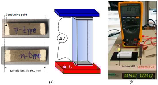 An example of cementitious thermoelectric composite (a) samples and testing setup; (b) testing procedure. Reprinted with permission from [].