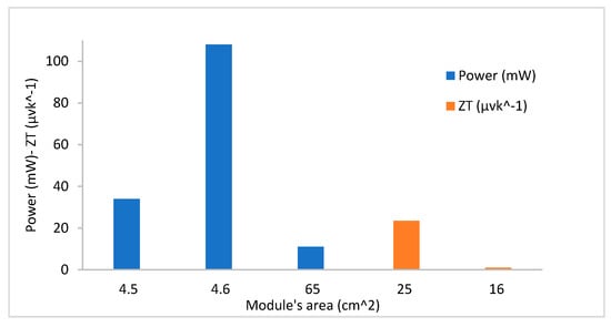 In another study, a thermoelectric module was connected to the hot surface by a Z-shaped piece, and its cold side was connected to a heat sink filled with water. Two different configurations of modules were built, a two-TEG and a four-TEG prototype (each with different sizes). It was observed that the two-TEG prototype (larger total surface area) and the four-TEG (smaller surface area) gave 8 mW and 11 mW on average over the testing period. Field test results showed that the power output of the harvesters peaked in May, although the maximum temperature gradient occurred in June and July [].