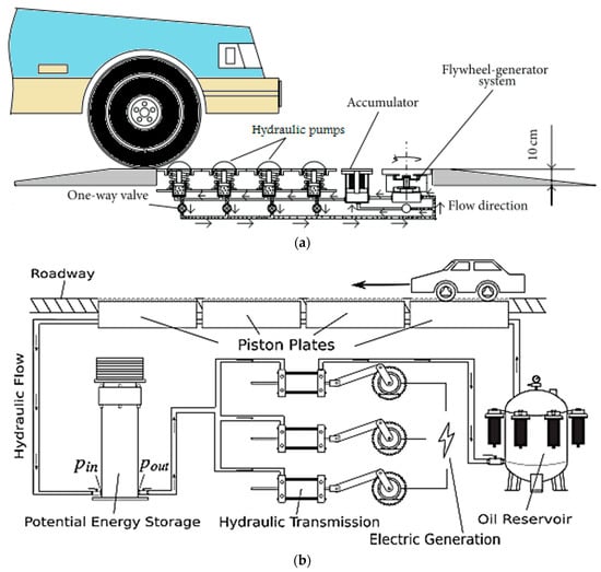 A few methods are known to have the potential of harvesting energy from roads, which can be divided into two groups based on their resources, namely solar energy heat or solar radiation and kinetic energy (mechanical vibration), which includes electromagnetic and piezoelectric generating systems [,]. It is worth mentioning that most of these methods are categorised as micro energy harvesters, which generate energy at a small scale (a joule or less) [].
