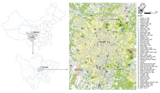 The study area is located in Chengdu, Sichuan Province, China (Figure 1). Chengdu is spread over 14,335 km2, and is located in the southwestern region of China (102°54′–104°53′ E, 30°05′–31°26′ N). Its population is 16.33 million, with an urban population of 11.94 million (as of 2018) [41]. Over the past decade, significant progress has been made in the construction of parks and varieties of green space facilities in Chengdu. Therefore, Chengdu is widely renowned as the “livable city” of China [42]. On 23 January 2020, the Chinese government gradually quarantined all cities in China to prevent the scale of infection from expanding. Aside from daily work, residents were restricted from going out. On 26 February 2020, the Chengdu Municipal Government lowered pandemic prevention and control levels from level 1 to level 2 [43]. At the same time, Chengdu began to issue health cards, and residents marked as “healthy” were allowed to go out for activities [44], and could go to parks in the city.