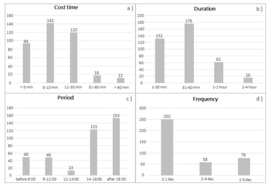 Figure 2. Urban park visitation patterns during the pandemic. (a) Cost time. (b) Duration. (c) Period. (d) Frequency.