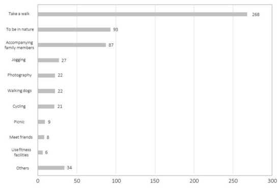 Visitation patterns were divided into five parts, i.e., time spent traveling from home to the park (Figure 2a), length of visit (Figure 2b), preferred visit time (Figure 2c), frequency of recent use (Figure 2d), and activities (Figure 3). The results indicate that more than half of the residents preferred to visit parks nearest to their homes, and the time spent traveling to parks was usually no more than 10 min; that is, visiting a park in their neighborhood was usually the first choice [29]. This may be related to the government’s recommendation that residents try to minimize going out, because a study has shown that traveling behavior in public spaces may lead to a potential risk of infection [47]. According to the results, during the pandemic, 176 (45.6%) respondents said that the duration of their visit in the park was 31 min to 1 h, while 78 (20.2%) reported visit times exceeding 1 h. We deleted one option (i.e., >4 h) because no respondents selected it, which indicates that 4 h seemed to be a threshold. In addition, most residents preferred to leave for the park in the afternoon or evening; 49 people (12.7%) preferred to leave before 9 am, and 13 (3.3%) chose to visit the park at noon. Overall, the numbers of people visiting the park in the morning, afternoon, and evening were similar. A study of visit patterns for the Hong Kong City Park by Mak and Jim (2019) reported the same results [48]. Finally, the weekly visit frequency of residents seemed to be at a low level. A total of 250 (64.8%) visited the park only one day a week, 58 (15%) visited occasionally, and 78 (20.2%) reported visiting almost every day. This result is different from previous studies. In normal times, most residents would visit urban parks more frequently [26,48], while during the pandemic, reduced visits may be due to the wish to reduce outdoor travel. Also, we inquired about the types of activities that residents engaged in in the park recently. According to the results (Figure 3, note, multiple responses), most residents chose “Take a walk” (268), “Accompanying family members” (87), and “To be in nature” (93), followed by “Jogging” “(27), “Cycling” (21), “Photography” (22), “Walking dogs” (22), “others” (34). Finally, a few responded “Picnic” (9), “Meet friends” (8), and “Use fitness equipment” (6).