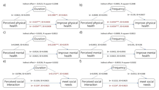 According to the total effects of model a (b = −0.4353, p < 0.001) and model e (b = −0.124, p < 0.05), the lower the residents’ perception of their physical health and social interaction level, the higher the posteffects. This demonstrates the role of urban parks during the pandemic, that is, visiting urban parks can significantly improve residents’ physical health and allow them to meet their social interaction needs. The total effect of model c (b = −0.0423, p > 0.05) was not significant, which is consistent with the result of Section 3.4, i.e., that residents agree that visiting city parks can improve their mental health, but this improvement is not significant. Additionally, duration as a mediator significantly affected these postvisit effects, while visit frequency had no significant effect (all p > 0.05). Therefore, the longer the duration of each visit, the higher the level of impact. It is possible that people had deliberately reduced the frequency of their visits, as most residents said they would now visit only once a week. However, the current results still indicate that even with a low visitation frequency, lengthy visits once a week can have a significant positive impact.