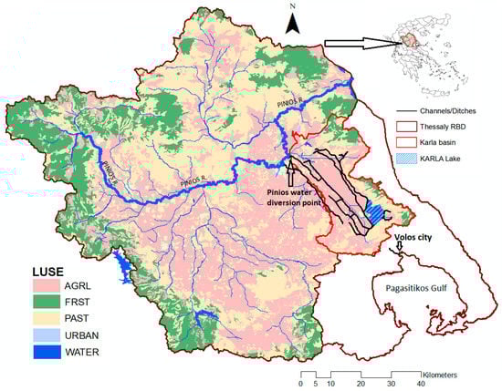 The agricultural Pinios river basin, including Lake Karla basin, and its location in Greece. LUSE: Land use type, FRST: Forest areas, PAST: Pastures, URBAN: Urban areas of high, medium and low density, WATER: Inland water areas.