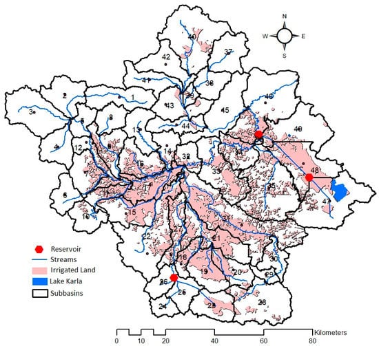 An HRU in SWAT can use as source for irrigation the aquifer, an outside source, the river, or a reservoir. If there is not adequate water in the water body, irrigation is applied up to the amount of water available. An extensive identification of the irrigation source has been done for all irrigated areas in the basin [8,9] and transferred to this study. One of the reservoirs is the Karla reservoir, located in subbasin 47 (Figure 3), which is planned to provide irrigation water to ~90 km2 (9000 ha) per year in the adjacent areas and was added to the model at subbasin 47. The Karla reservoir in the Pinios model serves as the single source of irrigation water for approximately 8000 ha of irrigated cotton areas of subbasin 47, which are sufficiently close to the planned 9000 ha. However, this was considered as a realistic deviation from the originally planned irrigated area, given the uncertainties in completing the irrigation networks. Water inflows to Karla reservoir arise from precipitation, inflows from the natural drainage of the upstream subbasin 47 but also the artificial delivery of runoff generated in subbasins 48 and 49, mimicking trapping to the lake through small pumping stations and collector channels. The greatest part of water inflows to the Karla reservoir arises from the constant water diversions from the Pinios River within the period October–April at a rate of 5 m3/s, resulting to the planned diverted water volume of 90 hm3/y [24,33].