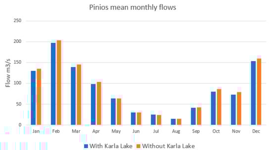 Pinios mean monthly flows simulated by SWAT at the outlet of the basin (subbasin 46, Figure 3).