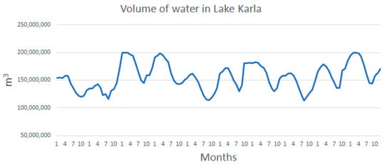 Water level should remain above the threshold of 2.5 m in Lake Karla. Given the 38 km2 water area of the lake, this corresponds to a minimum water volume of almost 100 hm3. On the other hand, water can rise up to 5 m in the reservoir increasing its water storage to ~200 hm3. Water quantities above this threshold are considered flooded water that is transported outside the lake.