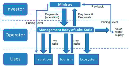 A proposed governance scheme of the NBS begins from the investor/decision maker and includes two other main levels—the operator(s) and the users. The EU and the Greek State form the investor in this study, who paid for the construction of the project and are responsible for its maintenance through a viable economic scheme based on cost returns. The regulator and high-level supervisor are represented by the Special Secretariat for Water of the Ministry of Environment and Energy and its local branch in the region, the Regional Water Authority of Thessaly. This multi-faceted organism will be called “the Ministry” from now on representing the investor who sets the rules (defining volumetric prices). The Ministry has to be in cooperation with the local management authority of the NBS, the established Management Body of Lake Karla. The Body applies the rules, having many responsibilities related to the operation of the NBS including the continuous implementation of the monitoring and environmental protection programs of the lake. In the administrative board of this body, representatives from local municipalities, the Ministry, the farmers union, the regional public authority, and environmental NGOs participate. Figure 6 presents this governance structure schematically, which is analyzed next.