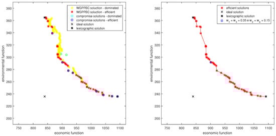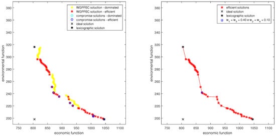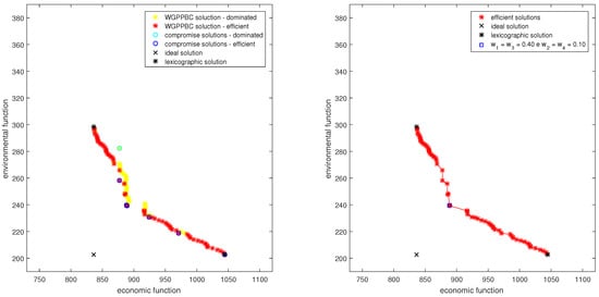 The compromise solutions represented by ○ and the square in Figure 1, Figure 2, Figure 3 and Figure 4 were found by the weighted goal programming technique using the weights , , , and , where , with and . The function is non-convex and non-differentiable, so in WTEEDP—LVP, some compromise solutions can be dominated, and the representation in the graph is the ○ symbol in light blue.