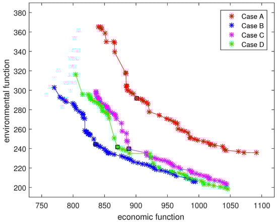 According Figure 5, we can see how the variation of the economic and environmental functions occurs for each case studied. From these results, we can verify among cases B, C, and D what the best decision related to the wind farm unit to be installed is in comparison with the results obtained in case A, considering the interest of the decision-maker in obtaining the reduction of the cost associated with the economic function or reduction of the emission associated with the environmental function .