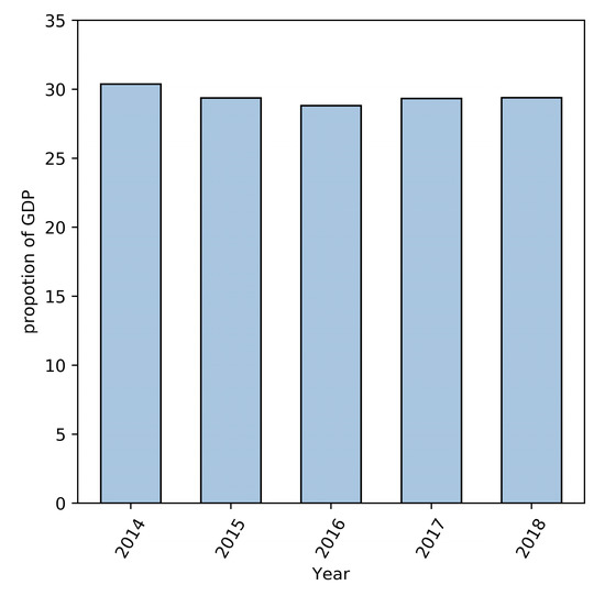 This paper aims to explore the connection of CSR, CFP, and financial distress. To do so, we compile data from CSMAR and Ranking CSR Ratings (RKS). RKS is an authoritative third-party rating agency for corporate social responsibility in China, dedicated to providing objective and scientific corporate responsibility rating information for responsible investors (SRI), responsible consumers, and the public. China’s listed companies of manufacturing are a good laboratory to test the relationship. The manufacturing industry is the principal part of the national economy in China. As part of the pillar industry, the listed companies in manufacturing are becoming the center of CSR, so it is imperative to evaluate the financial impact of CSR [15]. Figure 1 illustrates the proportion of manufacturing output in GDP, indicating the pivotal role of manufacturing in the national economy. Hence, the motivation of this paper is to explore the connection between the CSR and CFP of listed companies in Chinese manufacturing.
