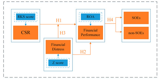Previous research has focused on the reflection between financial distress and corporate performance or financial distress and social performance [37,38]. A few studies have used financial distress as a moderator between the relationship of corporate performance and CSR in the Chinese manufacturing context. When a company gets into financial distress, on the one hand, managers will give priority to the interests of shareholders rather than all the stakeholders. At this time, they will not be as committed to the CSR as enterprises with a lower financial risk. On the other hand, the existence of financial distress sends a bad signal to the outside world. Even if the company fulfills its social responsibilities, it is difficult to convert social responsibilities into corporate performance like a healthy company can. Therefore, this paper blazes a new trail and uses financial distress as a moderator in the relationship between CSR and CFP. Thus, this paper proposes the hypotheses: