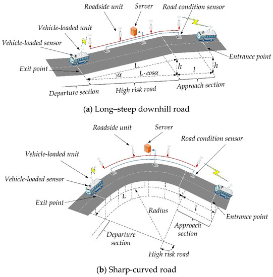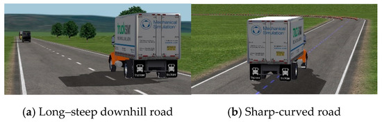 Due to the limitations of topography and geological structures, there are often some road sections with poor alignments on mountain highways, such as long–steep downhill and sharp-curved roads [1]. Heavy-duty vehicles, which have a high weight and high center of gravity, are prone to brake failure [2] and rollover accidents [3] on these dangerous road sections. Many governments and researchers have focused on the avoidance of brake fade on downhill roads [4] and improvements in vehicle lateral stability on curved roads [5]. A variety of approaches for safety enhancement, including the optimization of alignment design and the speed limit of downhill and curved roads [6], the development of high-temperature-resistant brake materials [7], and the improvement of vehicle structure design [8], have been proposed and achieved certain results. Auxiliary braking and active safety technology, such as engine braking [9] and electronic stability control [10], are being gradually applied to heavy-duty vehicles.