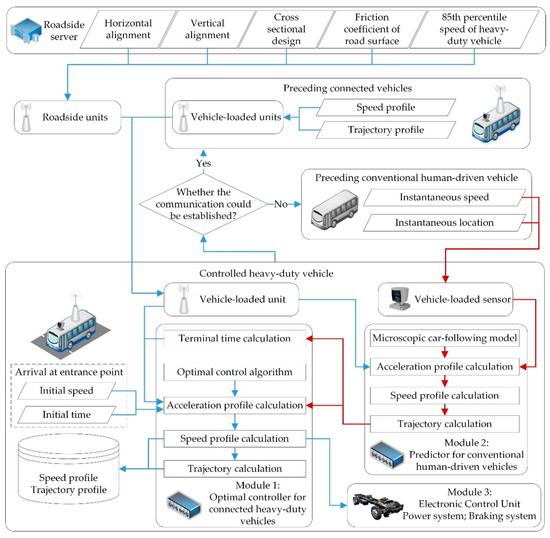The approaching section provides enough room for CHDVs to adjust their speed before entering the high-risk roads. The control structure of the proposed control system is shown in Figure 2. When a CHDV arrives at the entrance point of the control area, the control system is activated by the roadside signal received by the vehicle-loaded communication device. At that moment, this CHDV attempts to establish a communication connection with the preceding vehicles. Only the connected vehicle can respond to the request. If the nearest preceding vehicle is a connected one, its speed profile and spatial-temporal trajectory are transmitted to this CHDV. Hence, module 1, “Optimal controller for connected heavy-duty vehicles”, is activated directly. Otherwise, if the nearest preceding vehicle is a human-driven one, its instantaneous speed and location are detected by the vehicle-load sensors installed on the CHDV. In this case, module 2, “Predictor for conventional human-driven vehicles”, will be activated first. Then, the predicted speed profile and spatial-temporal trajectory are input into the optimal controller, and module 1 will be subsequently activated. All the aforementioned modules are installed on each CHDV, and their details are as follows.