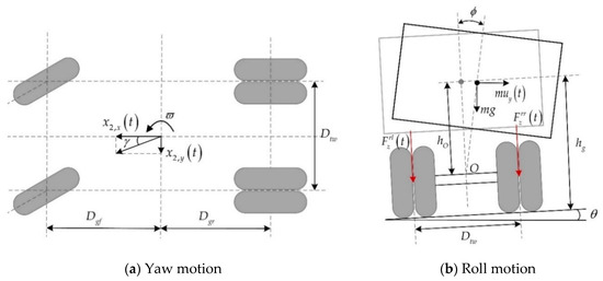 While running on sharp-curved roads, the centripetal forces from the tires act on the road surface towards the center of the curve, and the inertial force acts horizontally through the center of mass away from the center of the curve, as shown in Figure 3. These two opposite forces make the vehicle sideslip or roll towards the outside of the curve. An excessive sideslip angle and roll angle may lead to losing control of the vehicle or even result in a rollover accident for heavy-duty vehicles with a high center of gravity.