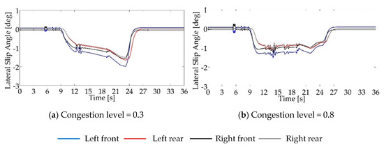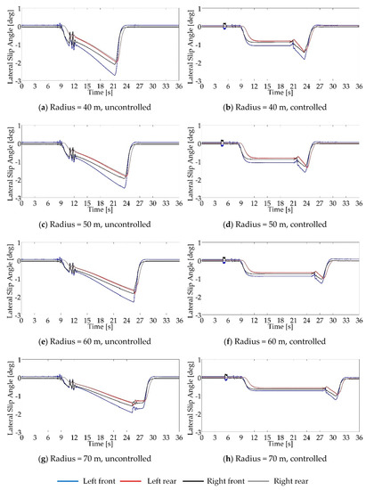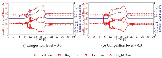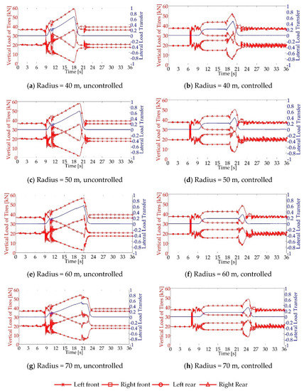 In rollover prevention research, the lateral load transfer ratio is a common performance index to define the safety area [55]. The real-time lateral load transfer ratio is