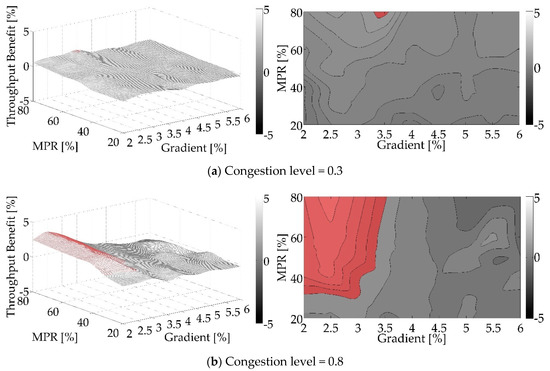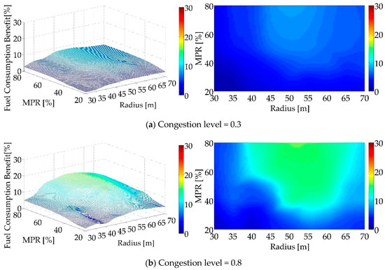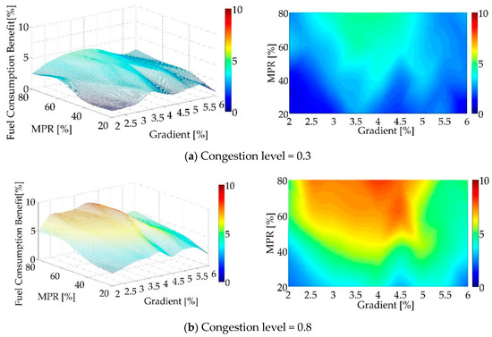 In the last decade, the rapid development of connected vehicle technology has provided brand new strategies for vehicle control. Many existing studies have attempted to utilize the information obtained through V2X communication to prevent traffic accidents such as vehicle collision and pedestrian crashes, but ignored the crashes of out-of-control vehicles [34]. Besides safety, ecology is a new research focus in the field of intelligent vehicle control, especially for heavy-duty vehicles with high fuel consumption and emissions [35]. Recent studies can also be divided into two categories: eco-driving on a freeway [36,37,38] and eco-approach at a signalized intersection [39,40]. The eco-driving on freeway is essentially a cooperative adaptive cruise control that reduces the speed oscillation of vehicles in platoon to decrease the accelerating and decelerating maneuvers with a high fuel consumption [37,38]. The eco-approach at signalized intersection involves a controller that smooths the vehicle speed trajectory to decelerate in advance and avoid idling maneuvers at the stop bar of the intersection [41,42]. These two ecological control strategies primarily improve the fuel efficiency of the vehicle by optimizing its kinematics state, instead of adjusting its dynamic state like active safety control. The difference between these two techniques is manifested in the traffic mobility of controlled road sections. The eco-driving can cluster vehicles into fast marching platoons to ensure that the throughput of the freeway remains at a good level [37,38]. The eco-approach makes vehicles slowly approach and enter the intersection, and thereby has significant adverse effects on the throughput of intersections [43]. This drawback leads to that the corresponding controllers cannot be implemented under moderate and high congestion levels. To solve this problem, some of the latest studies have proposed a new eco-approach strategy that prioritizes mobility over improving fuel efficiency [43,44,45]. The corresponding controllers force vehicles to accelerate before reaching the stop bar and drive through the intersection at the tightest headway and legal speed limit. The throughput of the intersection can thus be ensured to be optimum [46,47]. Apart from directly controlling the kinematics state of vehicles, some other eco-driving systems utilize the information on vehicles’ kinematics state and road infrastructure to evaluate the instantaneous fuel consumption of vehicles, and according to improve the driving style of human drivers [48,49]. These systems can be generally applied on freeways and at intersections, and significantly reduce the fuel consumption, while cannot achieve an optimum status of fuel efficiency. However, these studies about ecology speed control mainly focused on the vehicles on straight roads or urban networks with multiple intersections. This ideal of ecology control has not been introduced into the speed control on downhill and curved roads.