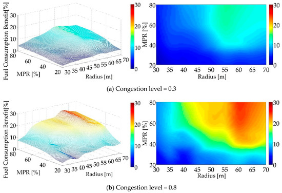 Sustainable transport should be safe, eco-friendly, and efficient [50], but few studies take these three important performance indexes into overall consideration. Some recent studies only adopted vehicle safety as a constraint to optimize fuel efficiency and traffic mobility. Safety, fuel efficiency, and traffic mobility cannot simultaneously be at good levels [46,47]. Moreover, most controllers proposed in these studies were designed on the basis of accurate information on the surrounding vehicles, and can only be implemented in fully connected vehicles environment [37,38,39,40,41,42]. The poor robustness of these controller to traffic randomness leads to no feasibility of implementation in the near future [43]. Then, some more practical controllers were developed, which release speed information using traditional roadside speed limits [51]. These controllers macroscopically optimize the movement of entire traffic consisting of connected vehicles and human-driven vehicles, allowing them to be readily implemented in the real world [52]. Most of these traditional controllers prefer to adopt low speed limits to ensure driving safety, and leads to significant adverse effects on the throughput on the roads [53]. This phenomenon can further cause traffic congestion under high saturation conditions. So how to solve the contradiction between the practicability of control system and traffic mobility will be the future research focus.