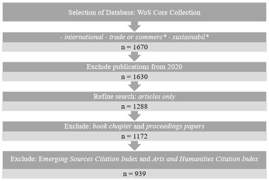 For the preparation of this bibliometric study, different terms were selected (see Figure 1): international; trade or commerc* and sustainabil*. The symbol ”*” was used in two of them in order not to exclude the rest of words belonging to the same lexical family, such as commercial, sustainable or sustainability.