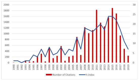 In contrast, the number of citations showed a disparate trend to that of the number of publications (see Figure 3), evincing small peaks in the mid1−990s, but with a slight growth, until reaching its maximum value in 2015.