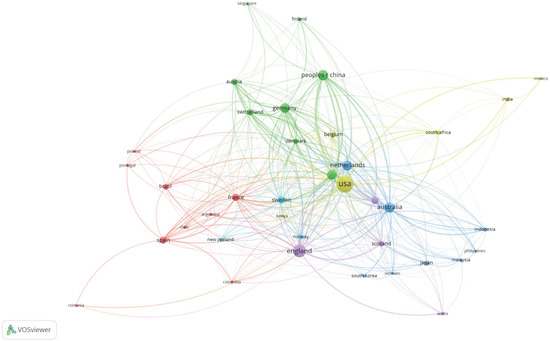 In order to delve deeper into the country analysis and the potential links between them, a co-citation cluster map between countries was created (see Figure 4). The cluster map included 38 countries that had published at least six articles out of the 106 that had published at least one article.