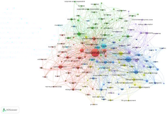 To analyze the main trends related to international trade and sustainability, two cluster maps were produced using a fractional method: one to analyze trends in keywords used by authors (see Figure 6), and the second to examine possible trends in publishing countries (see Figure 7).