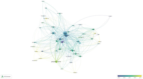 The cluster map shows a clear co-citation link between the main nuclei mentioned in Table 3: United States, United Kingdom and China. Both the European and the Asian countries had a close link to the United States, although the links between each other were not as strong. In contrast, the strongest link on the entire map was between the United States and China, representing 17.05% for the United States. For China, its co-citation link with the USA represented 35.96% of all publications.