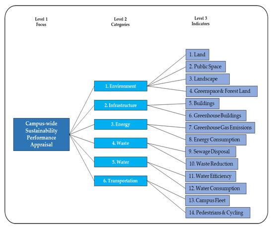 Again, it was discovered that AHP was either utilized in addition to other theoretical approaches and methodology in ensuring a better outcome or as an independent method. This shows that the incorporation and/or the adoption of AHP in the field of campus planning, development, and assessment to ascertain the level of importance of variables is a welcome development. Although other weighting methods, such as TOPSIS, REMBRANDT, and ANP, produce reliable decision-making outcomes, however, AHP has a remarkable edge over them because they are more complicated, challenging, and protracted [37]. After the completion of the social media approach of environmental-dimension indicators with campus-wide and spatial-based attribute identification, experts with urban planning, designing, impact appraisal, etc., knowledge and skills registered with the Association of Town Planning Consultants of Nigeria (ATOPCON) were consulted for validation. This was followed by the development of a three-level hierarchy (Figure 2), with the overall goal of a campus-wide sustainability performance appraisal on the first level, followed by six category levels with 14 indicators applicable within the context of HEI campuses in Nigeria.