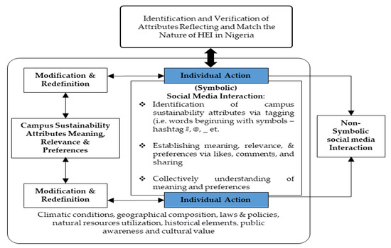 Due to the non-utilization of a theoretical basis that ensures the monitoring and appraisal of CSA using social media UGC, the authors adopted symbolic interactionism as a theoretical basis for appraising the sustainability in HEI campuses based on social media data. The theory has several applications on studies relating to CSA and framework development. Although many scholars have challenged the approach of symbolic interactionism claiming that it only focuses on broad and macro-sociological issues [41], this criticism has been rejected [42,43]. The application of the theory in several other academic disciplines [44], as well as other theories [45,46], has further provided justifications to debunk the claims that the theory could not be applied at micro-level and in other disciplines. Other scholars were also able to incorporate the epistemological assumptions of symbolic interactionism with other theories and other socio-cultural studies [47,48,49,50].