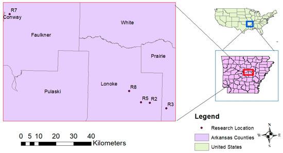 The experimental fields in this study consist of five fields in an annual soybean–rice rotation coded as R2, R3, R5, R7, and R8. These fields are located in Faulkner (R7), Lonoke (R2, R5, R8), and Prairie (R3) counties in Central Arkansas (Figure 1). The R7 field has Perry clay soils, is in hydrologic soil group D, and is located around 80 km from the others. The rest of the fields have Stuttgart (R2, R5), Dewitt (R3), and Calhoun (R8) soil series, are within 13 km of each other, and have silt loam soils in hydrologic soil group C/D. Table 1 summarizes the general characteristics of these fields.