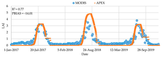 An example of leaf area index (LAI) calibration results from 2017 to 2019 for soybean–rice–soybean at field R2. Note that the APEX model did not simulate the period between the two crops, but the MODIS image provided some values greater than zero that was likely due to grass, weed, or root biomass.