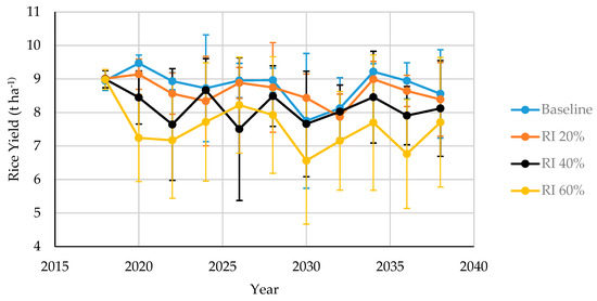 Average simulated rice yield of all fields from 2018 to 2038 under baseline irrigation and reduced irrigation (RI) percentages of 20, 40, and 60%. The error bar is the standard deviation.