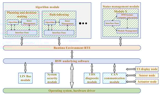 Here, the embedded software architecture can implement relatively independent algorithms and divide the logic set into a system module. Its input and output are evident, including the internal management logic, algorithms, and interface function. Moreover, there is no direct interaction between the module and the underlying modules, and the global variable is no longer used. All data transmission is implemented using interface functions defined in RTE, which is mainly responsible for the initialization and assignment of the interface function [55]. The module can obtain the corresponding variable data by calling the interface function.