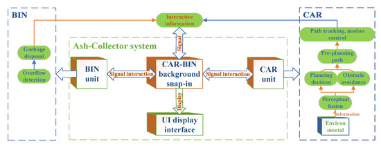 First, the improved architecture has a stable communication mechanism, which can realize the fast and effective information exchange between the automatic WCV, waste bin, and background-monitoring center. The system adopts distributed architecture, realizes the hierarchical operation of message transmission tasks through independent nodes, reduces the pressure of real-time computing, and can provide a convenient hardware driver interface for robots and sensors. The distributed architecture system is divided into three entities, i.e., node, network and storage. Technicians can connect to the network and realize storage through external interfaces, which means that successful external cases can be cited to supplement and improve the system [56]. It dramatically reduces the difficulty and complexity of the development of the unattended sweeper system, and contributes to the expansion and maintenance of the system functions. In addition, the distributed architecture system has the characteristics of easy development, few faults and clear structure [57]; it thus can integrate students from different directions and fields to participate in design and research, which helps increase the development of the whole system.