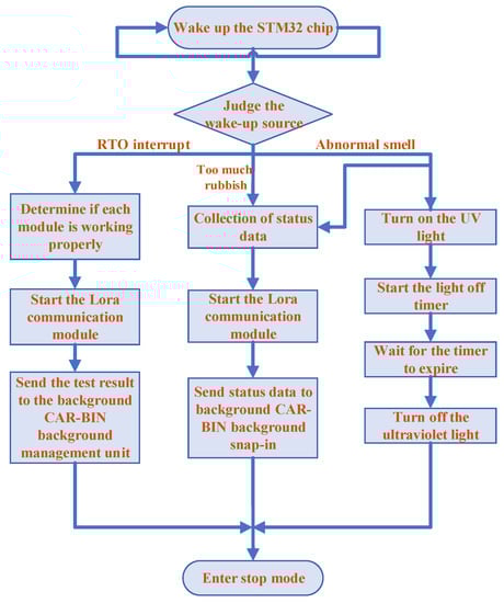 Intelligent waste bin built-in sensors, such as ultrasonic sensors and odor sensors, are used to detect the remaining bin capacity, waste odor, and other information to provide data source for the entire regulatory system and the amount of waste to be collected to ensure timely waste removal, odor detection, and ultraviolet sterilization to ensure urban environmental hygiene. When the BIN unit monitors an abnormal state, the corresponding data is sent to the CAR-BIN background management unit through the LoRa communication module for analysis and the proposal of any corresponding countermeasures. The following subsections describe the status reporting module, overflow self-checking module, and waste collection module.