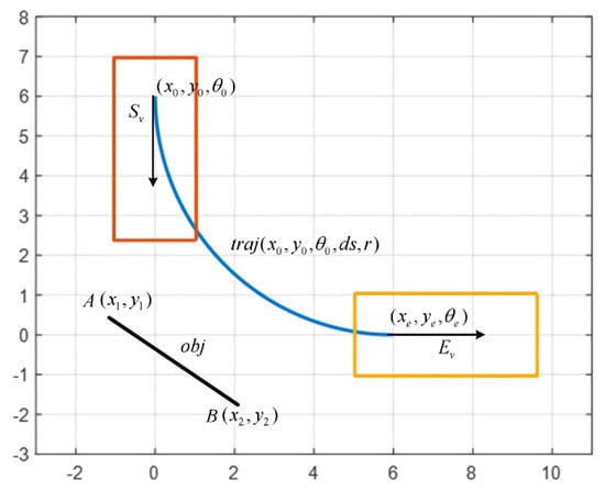 - Path and obstacle representationAs shown in Figure 11, any path trajectory, traj, is represented by five parameters of , where is the starting position of the WCV corresponding to the path, is the length of the path, and is the radius corresponding to the path ( > 0 means the left turn of the WCV, < 0 means the right turn of the WCV, and = 0 means the WCV is driving in a straight line). With this method, any obstacle, obj, is represented by a line segment, which is described by two endpoints and .