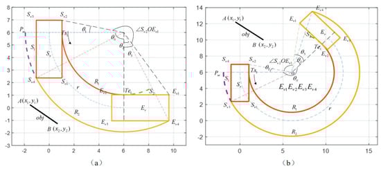 Figure 12. Schematic diagram of the collision detection parameters of arc path obstacles. (a) shows the path collision detection parameters before the obstacle is encountered, (b) shows the path collision detection parameters after the obstacle is encountered. - (3)