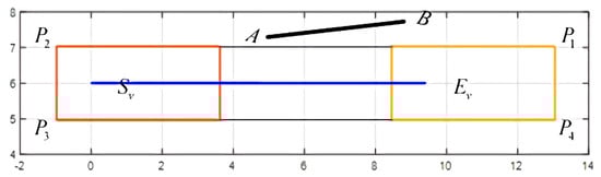 Figure 11. Schematic diagram of paths, obstacles, and WCV profiles.In the process of collision detection, the outline of the WCV is simplified to a rectangle. Obstacle collision is detected according to the path contour, i.e., the boundary contour formed by the WCV driving along the specified path from the starting position to the end position [62]. According to the size of , the detection is divided into arc-path-obstacle-collision detection and straight-line-path-obstacle-collision detection [63]. - (2)