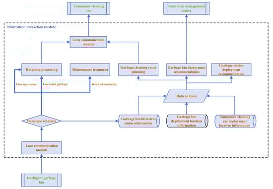 The default boot mode of the system is automatic, involving an intelligent waste bin equipped with a capacity sensor, to detect the amount of waste in real time. When the amount of waste exceeds a preset threshold, it summons the intelligent WCV to empty it. However, the process of waste disposal is not limited to waste bins that exceed the threshold. When the WCV is in range, the optimal benefit module guides it to the nearby waste bin to collect its waste. Then, it returns to the waste transfer station and prepares for the next removal task. Figure 3 provides the system’s flow chart.