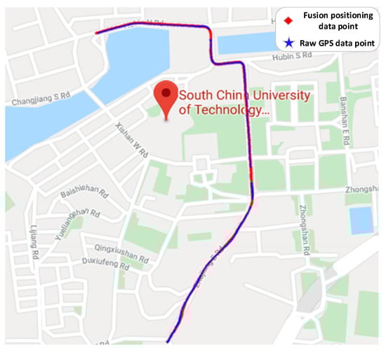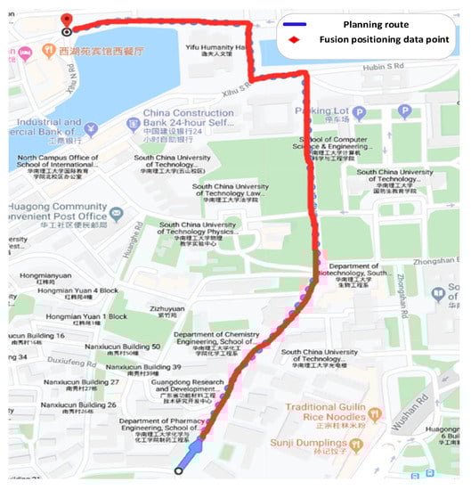 The positioning of the odometer is made by the IMU + encoder, in which the IMU uses a GY−85 nine-axis degree of freedom sensor. The angle and acceleration information (measured by the IMU) and the velocity information (measured by the encoder) are fused by an extended Kalman filter to track the WCV, which effectively reduces mileage drift. The GPS positioning module uses a Qianxun RTK decimeter class GPS/Beidou module with 1 Hz frequency and positioning accuracy at the decimeter level. The lossless Kalman filter fusion of the angle and acceleration information measured by the IMU and the output data information of the GPS/Beidou module is intended to compensate for the excessive positioning cycle of the GPS and render the sweeper positioning more accurate.