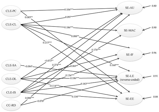 Note: 1. CLE = classroom learning environment, PC = peer cooperation, CL = cooperative learning, SA = student autonomy, DL = learning difficulties, IS = intellectual stimulation; 2. CC = campus climate, RD = respect for diversity; 3. SE = student engagement, AU = participation for analytical understanding, MAC = meeting academic challenges, IF = interaction with faculty, LE = lack of engagement, EE = extracurricular engagement.