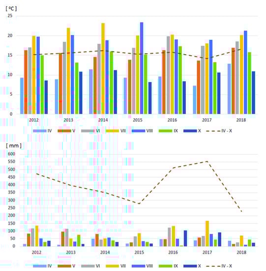 The meteorological data came from the iMetot automatic station located in the experimental field. Generally, it should be stated that the thermal and humidity conditions in the maize growing seasons were very diverse (Figure 1). The most optimal conditions for maize growth and development were recorded in the years 2012, 2016 and 2017. The worst meteorological conditions for maize growth and development were recorded in 2015 and 2018. These were the years with the lowest precipitation, below 300 mm.