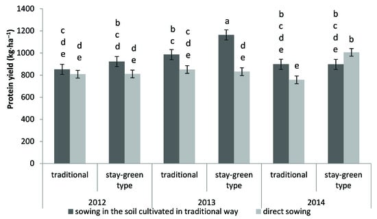 Mean values of the protein yield for the combinations of three years; two methods of sowing maize and two types of varieties (YAB); a, b, c, d, e—homogeneous groups (α = 0.01).