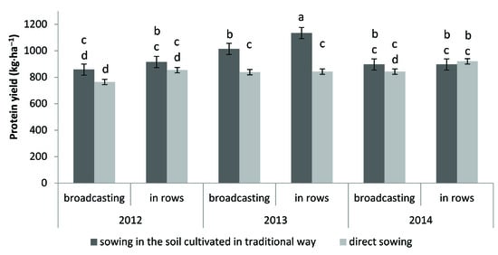 Mean values of the protein yield for the combinations of three years; two methods of sowing maize and two methods of sowing NP fertilizer (YAC); a, b, c, d—homogeneous groups (α = 0.01).