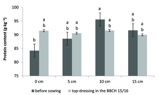 In Experiment II, significant differences in the mean protein content were found only depending on the depth of NP fertilization and on the interaction between the depth of NP fertilization and the date of supplementary nitrogen fertilization (Table 7 and Table 8). It was shown (Figure 4) that relative to broadcast NP, the protein content in the grain increased significantly when NP fertilizer was sown at a depth of 10 cm before the application of supplementary nitrogen (irrespective of its type, i.e., ammonium nitrate or urea). However, the other sowing depths (5 cm or 15 cm) did not significantly change the protein content in the grain, relative either to broadcast NP or to sowing at a depth of 10 cm.