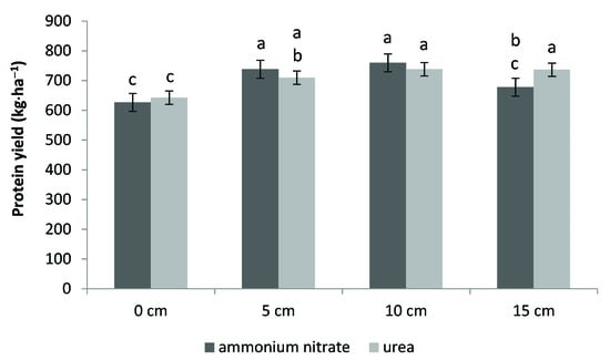 Mean values of the protein yield for the combinations of four depths of fertilization (A) and two types of nitrogen fertilizer (B) in 2015–2018; a, b, c—homogeneous groups (α = 0.01).