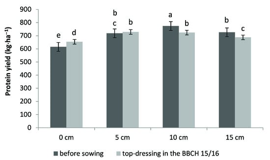 In the four-year study period, the significantly highest yields were obtained for the combination of type of nitrogen fertilizer and the date of nitrogen application in 2016 (irrespective of the depth of fertilization). It was found that both ammonium sulphate and urea used before sowing or with top-dressing at BBCH 15/16 did not significantly differentiate mean protein yields (Figure 7). When considering (Table 12) a combination of three (A, B, C) factors (regardless of the year of research), a significant increase in the mean values of the protein yield was observed when a sowing depth of at least 5 cm was used. The highest means of the yields were observed for the ammonium nitrate and urea used before sowing at a sowing depth of 10 cm. However, these means do not differ significantly from many other means of the protein yield for A × B × C combinations with a sowing depth of at least 5 cm. Considering the significant interaction of all factors with the years of research (Table 9), the highest yields were found in 2016, wherein the significant highest mean yield was obtained for urea application before sowing and a 15 cm depth of fertilization.